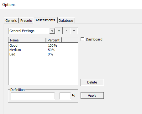 To add a new assessment, write the name at the edit field of the combo box and click +