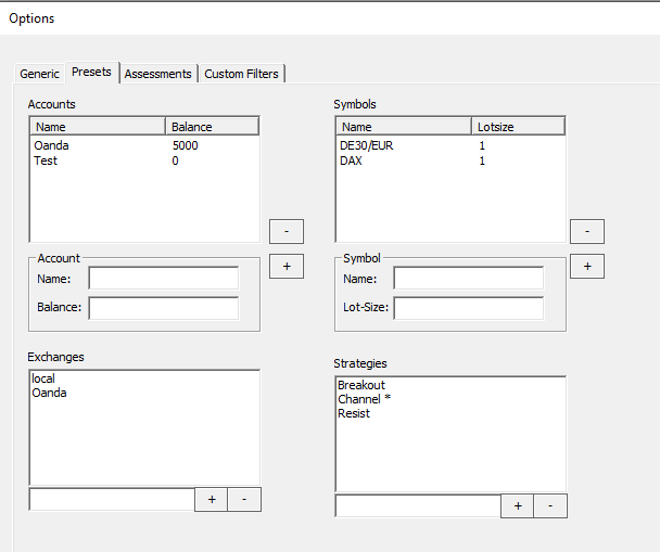 The presets will be used to define the basic elements of a trade.